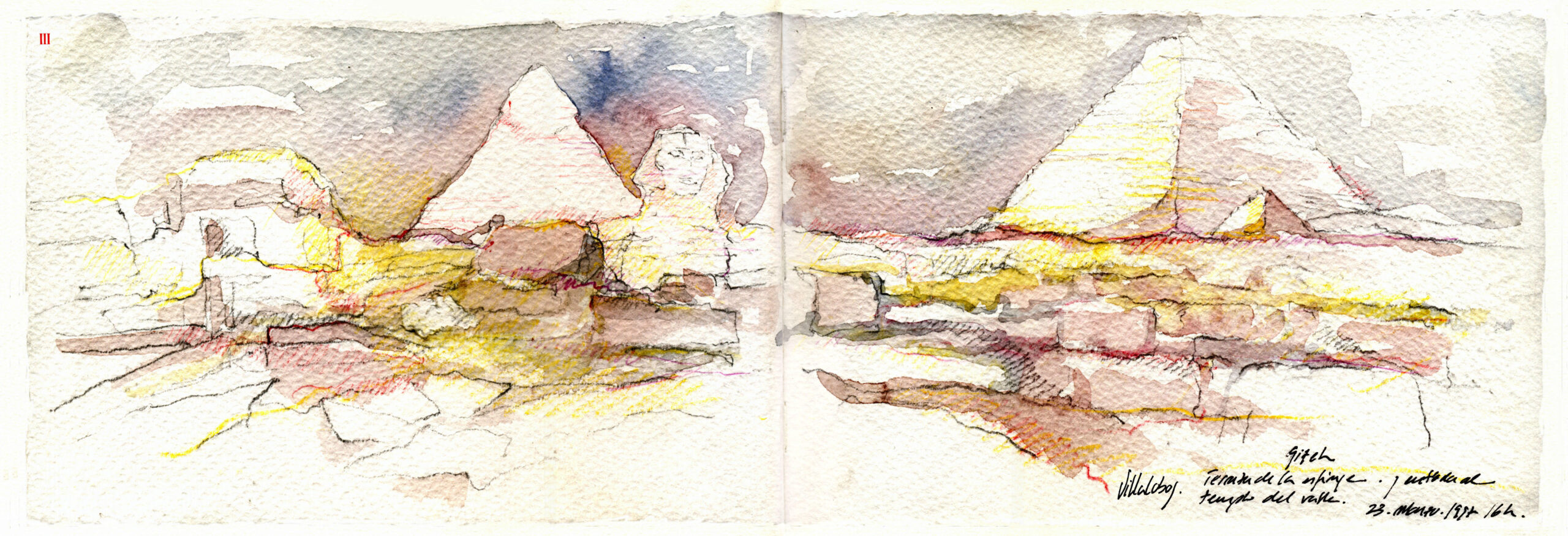 Dibujo III. Gizeh. Terraza de la esfinge y entrada al templo del valle. 23, Marzo, 1997. 16 h. Daniel Villalobos Alonso.